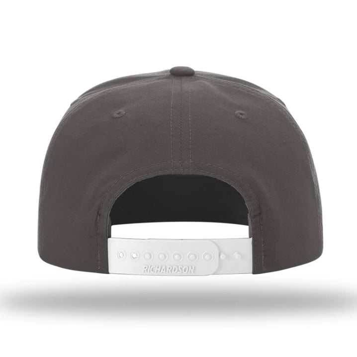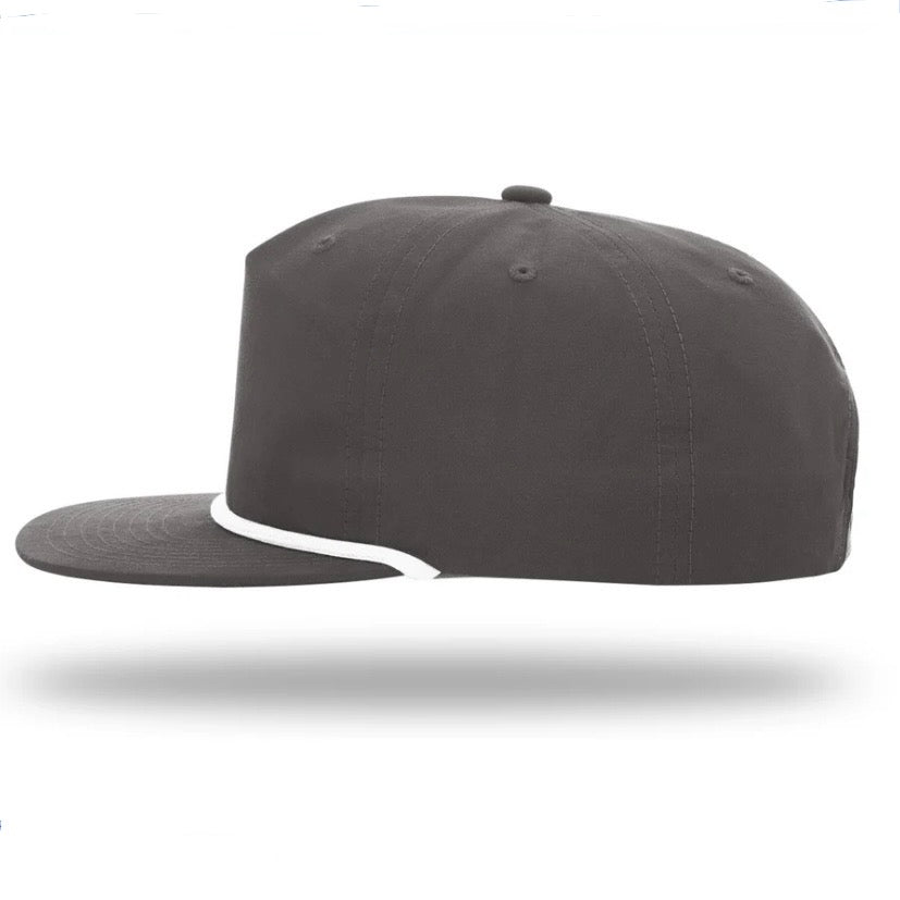 Charcoal grey snap-back rope hat.